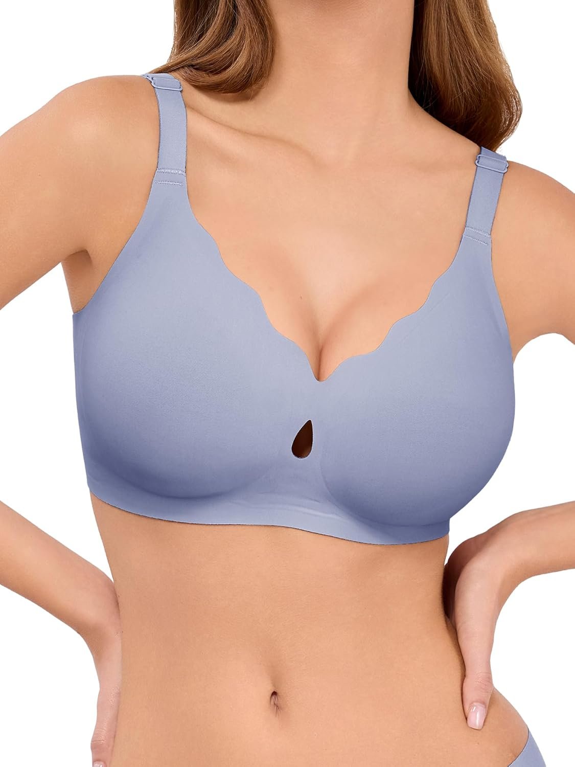 - ELEGANT WAVE AND DROP DESIGN: seamless bras feature a delicate wavy edge design that enhances natural curves and gives you a smooth, rounded silhouette. The scalloped bra edges contour gently to your bust, creating a flattering shape. The low-cut V-neckline with a water-drop design adds a feminine touch and highlights your bust. This women’s everyday t-shirt bra for women is lightweight, invisible, and non-see-through, giving you a smooth look under your clothes.