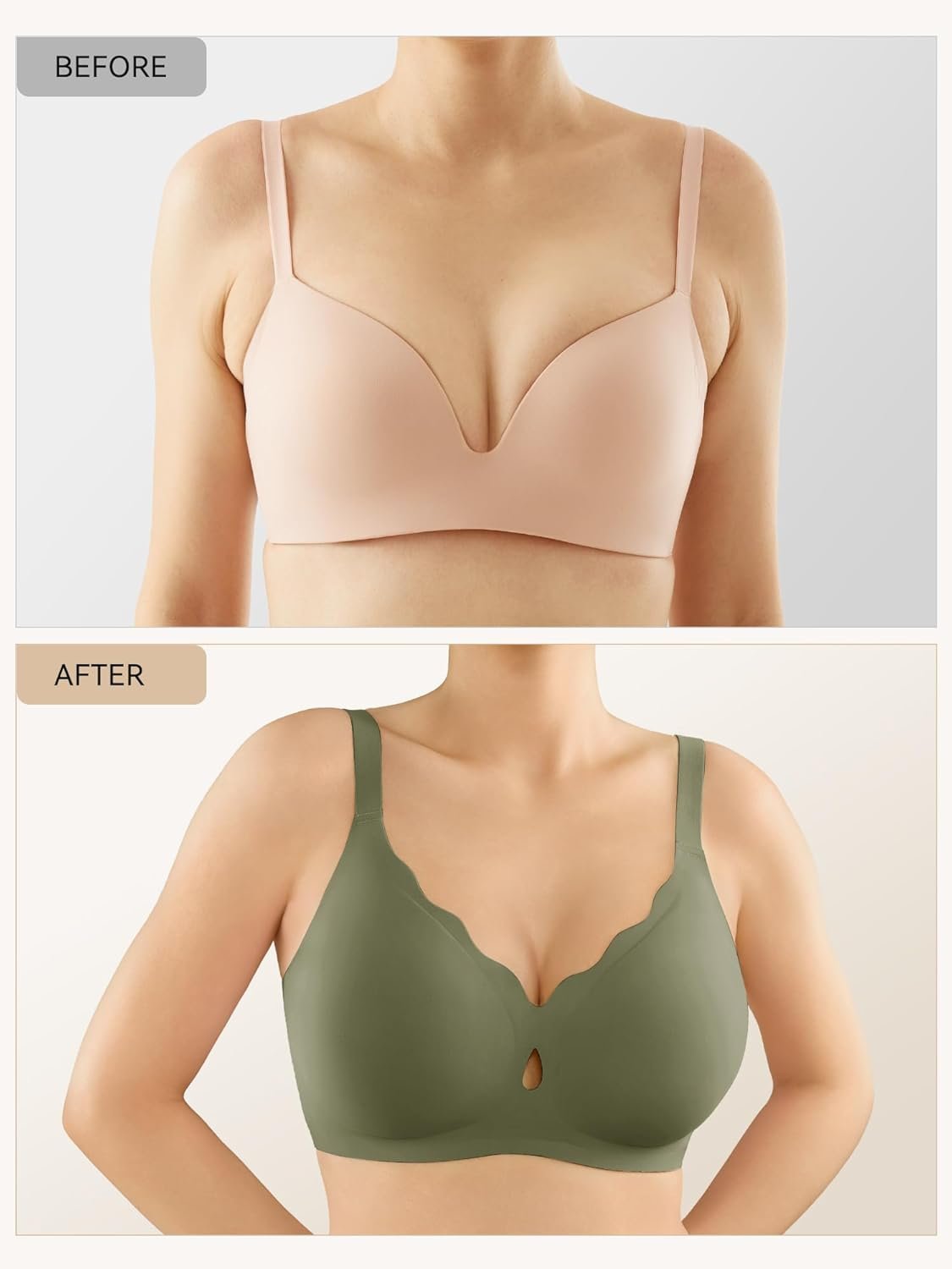 - ELEGANT WAVE AND DROP DESIGN: seamless bras feature a delicate wavy edge design that enhances natural curves and gives you a smooth, rounded silhouette. The scalloped bra edges contour gently to your bust, creating a flattering shape. The low-cut V-neckline with a water-drop design adds a feminine touch and highlights your bust. This women’s everyday t-shirt bra for women is lightweight, invisible, and non-see-through, giving you a smooth look under your clothes.